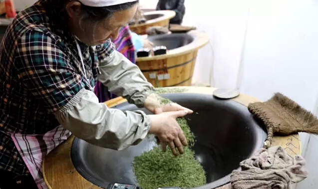 殺青過的茶葉攤涼后進行揉捻,揉捻根據茶葉的老嫩程度決定茶葉的揉捻時間及壓力大小,使茶葉初步成形及細胞破損。